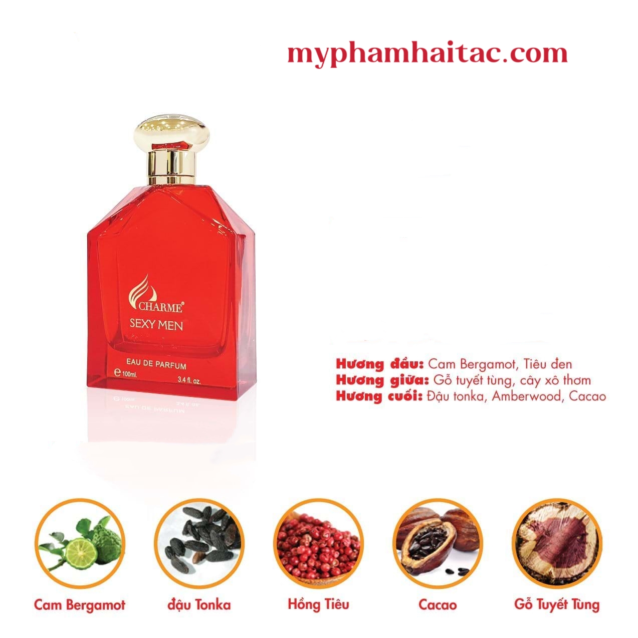 - Đúng như tên gọi, “chàng trai quyến rũ” nổi bật với hương gỗ tươi mát từ phương Đông.Từng nốt hương quen thuộc như: cam Bergamot, đậu Tonka, Hồng tiêu, Cacao và gỗ Tuyết tùng cuộn tràn trong từng giọt nước hoa tạo nên một sức hút khó cưỡng với mọi cô nàng.Mùi hương Nước hoa Charme Nam của nó đến từ sự ngọt ngào và ấm áp khi hòa quyện hương Cacao, Đậu Tonka và hương gỗ Hổ phách lại với nhau.