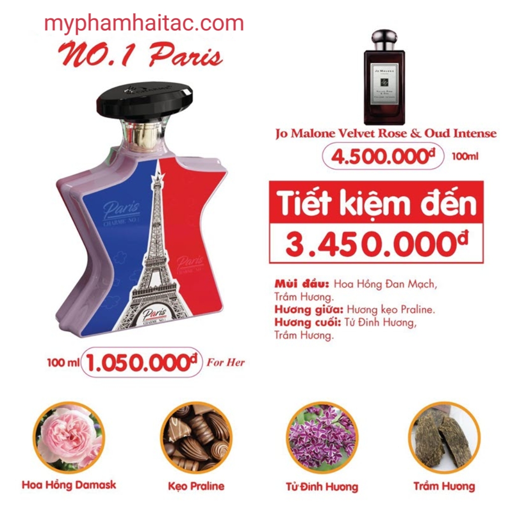 Nước hoa Charme No.1 Paris đã được Charme tung ra vào cuối năm 2020. Lấy cảm hứng từ những nốt hương thuộc nhóm hương hoa cỏ phương Đông đầy thu hút dành cho tất cả mọi người. Với bốn nốt hương là Hoa hồng Đan Mạch, gỗ trầm hương quý giá, kẹo nhân hạt và tử đinh hương.