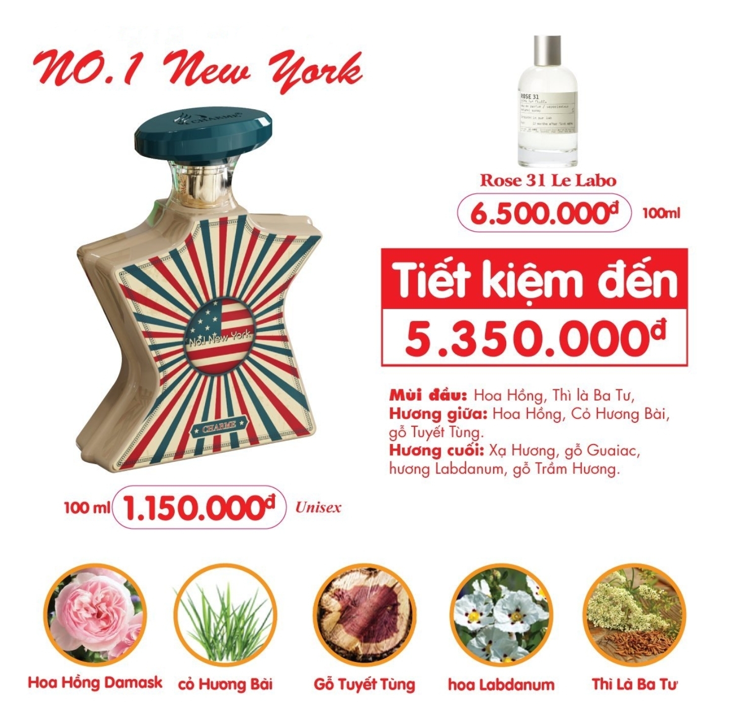 - Hương giữa: Hoa hồng, Cỏ hương bài, Gỗ tuyết tùng